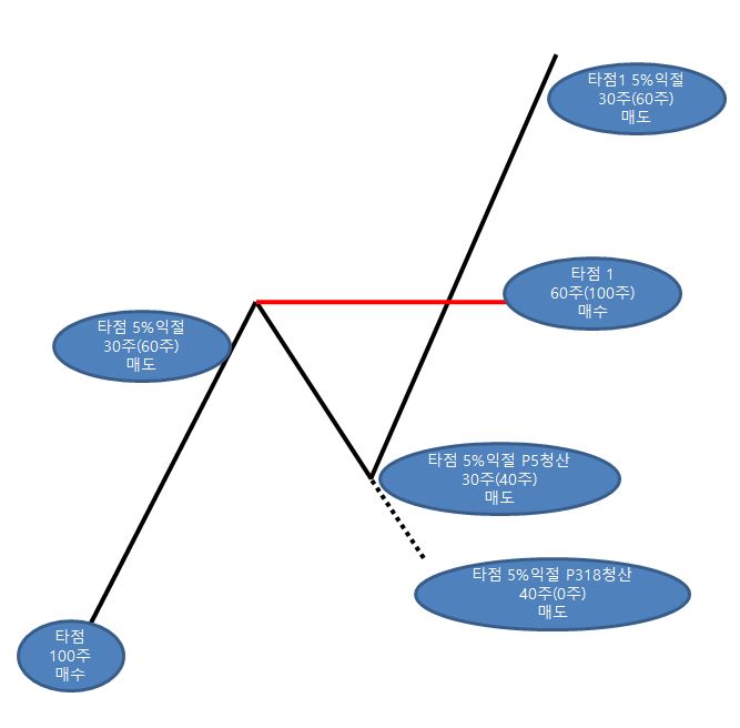 타점 에서 100주 매수후 30주 매도 하고 중간에 30주 매도 해서 총 40주가 남은