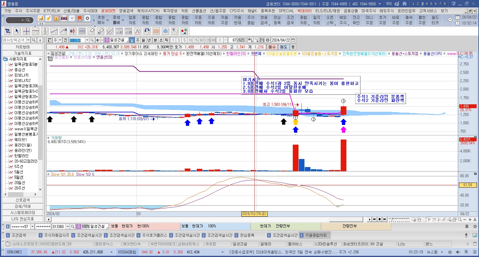Condition1 = var1 >= 0 and CrossUp(c,Var2) and C >= C[1]*1.03 and C > O and C > 중심 and 중심 > 0;