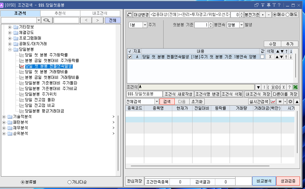 " 당일 첫 분봉 캔들(음봉 또는 양봉 ) N회 연속발생" 이 있습니다.