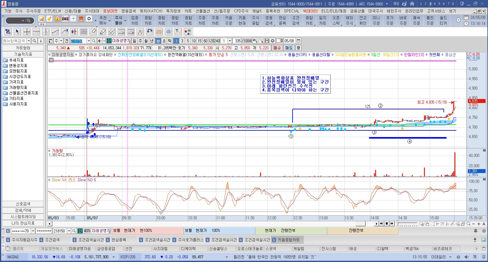 두번째는 5일선을 돌파하는 과정에서 분봉상 10회 이상의 완전정배열이 나올 때 종목검색을 부탁드립니다.