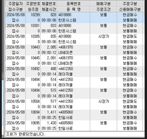 다만 올리신 화면애서 시간은 체결시간입니다.