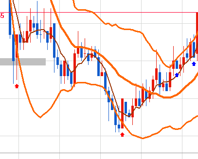 볼린저 밴드 하단을 상향 돌파할때 화살표 신호가 발생하게 만들고 싶습니다.