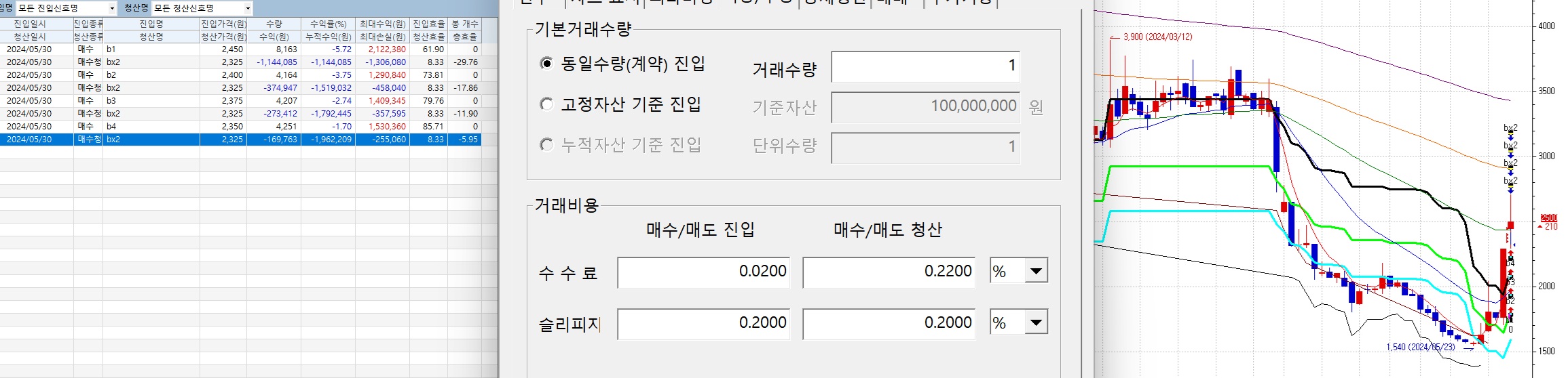 그리고 샤페론 같은 경우에는 매도 후 저가 갱신하고 내려간 후에 다시 차트에 적용해보니까 손실이 발생하는 걸로 내용이 변경되는데