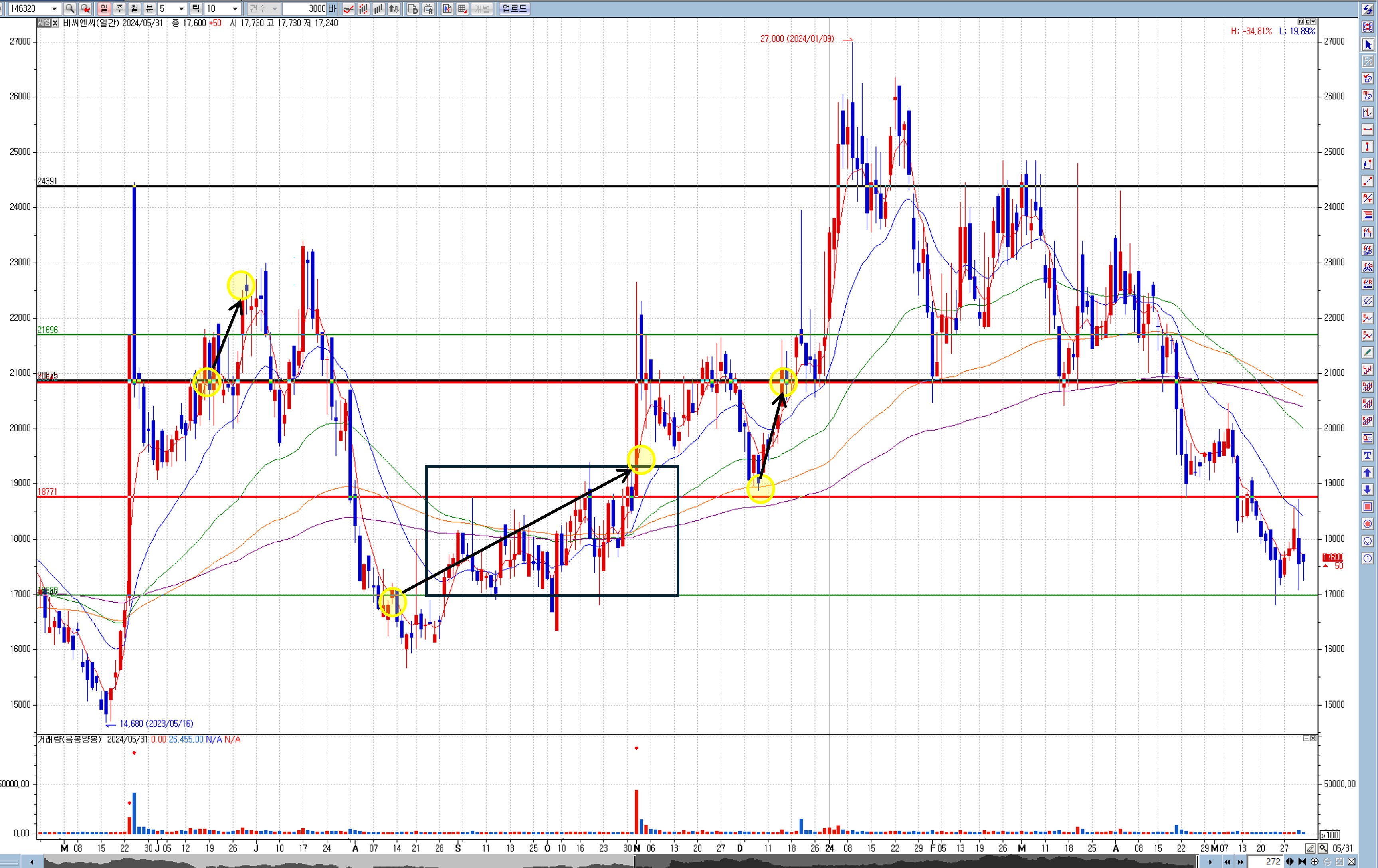 * 240일 최고거래량이 발생(거래대금 100억 충족)한 봉의 시가와 종가를 이후 480일 동안 차트에 그림