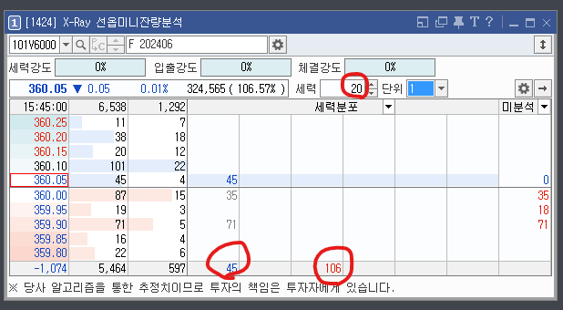 그림1 x-ray 선옵미니 호가잔량 분석에서 수량20 이상을 세력이라고 가정하면 매도세력잔량은 45, 매수 세력잔량은 106 이 나옵니다.