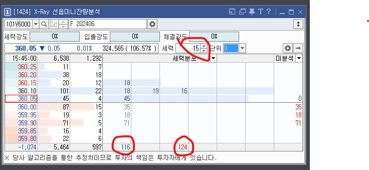 그림2에서는 15개 이상의 수량을 세력이라고 가정하면, 매도세력잔량은 116, 매수세력잔량은 124 가 나옵니다.