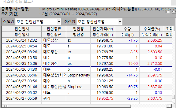 > 해외선물 시간설정을 다음과 같이 적용하여 시뮬레이션을 돌려 봤더니 시간설정 범위외에서도 진입청산이 이루어진 것을 발견했습니다.