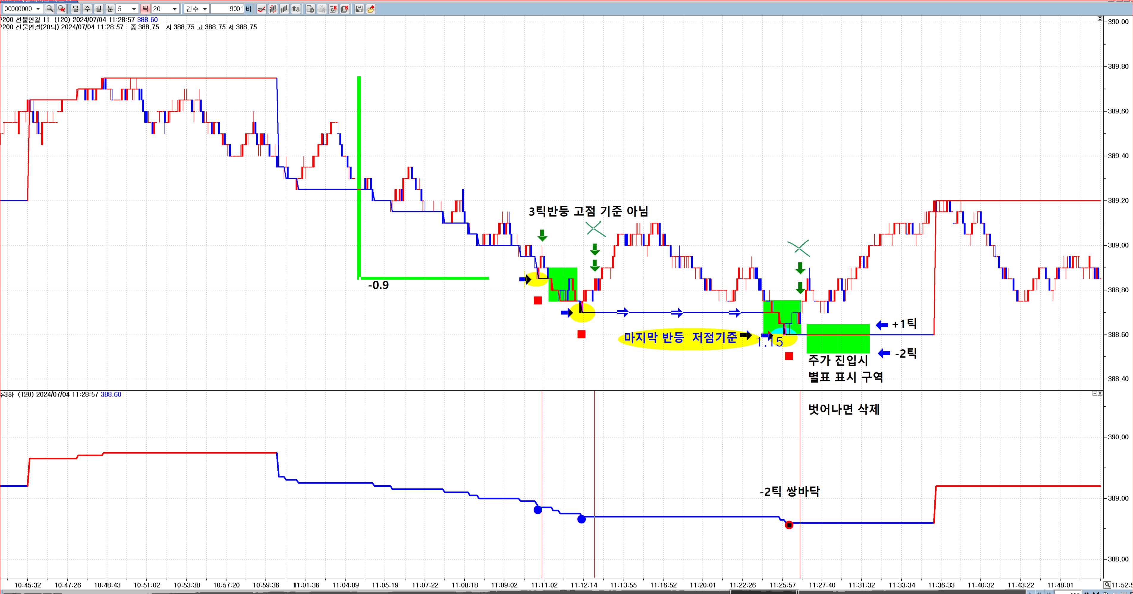 현재봉 종가가 위 기준값 대비 +1틱~-2틱하이면 그려지고 아니면 삭제됩니다.