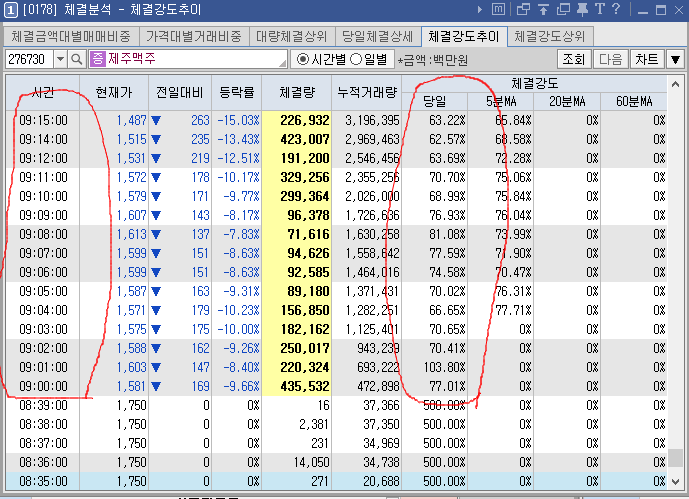 (금일 제주맥주 K사의 체결강도 1분봉상. 최저 52% 최고 103% 이었습니다)