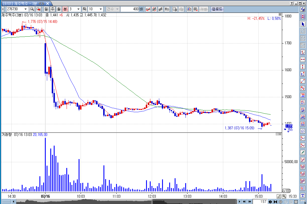 1분봉은 거래가 안되는 봉이 있기에 3분봉으로 검색 하였으며 분봉 거래량을 확인해보면