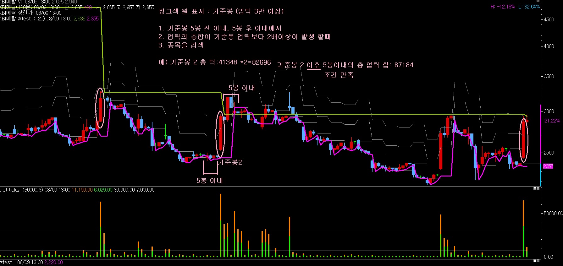 기준봉을 기준으로 전 5봉 이내, 후 5봉 이내 각각 구간을 설정해서 5봉 업틱의 총 합이 기준봉보다 2배이상일 경우 검색을 하고 싶습니다