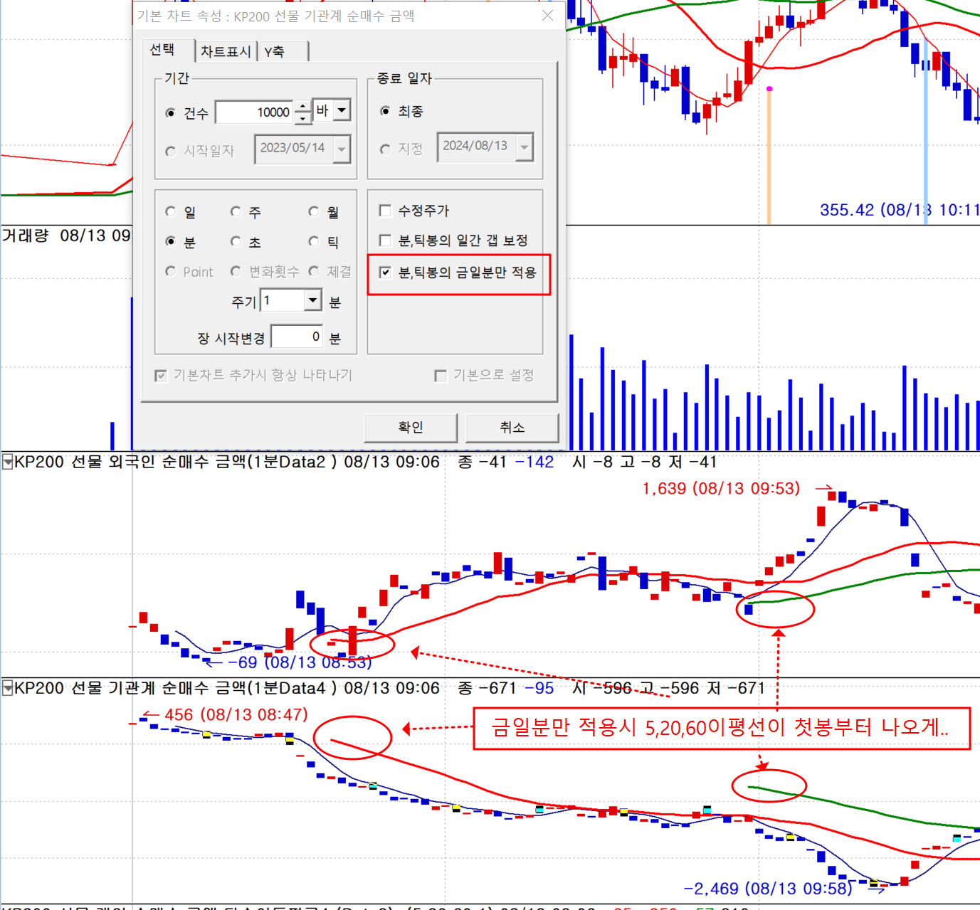 번거럽겠해서 죄송하지만 ,..분,틱봉의 금일분만 적용시 에 체크해도, 5,20,60이평선이 첫봉부터