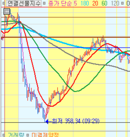 1. 예시(키움차트)와 같이 차트에서 20선 종가가 20선 위에 있으면 노란색