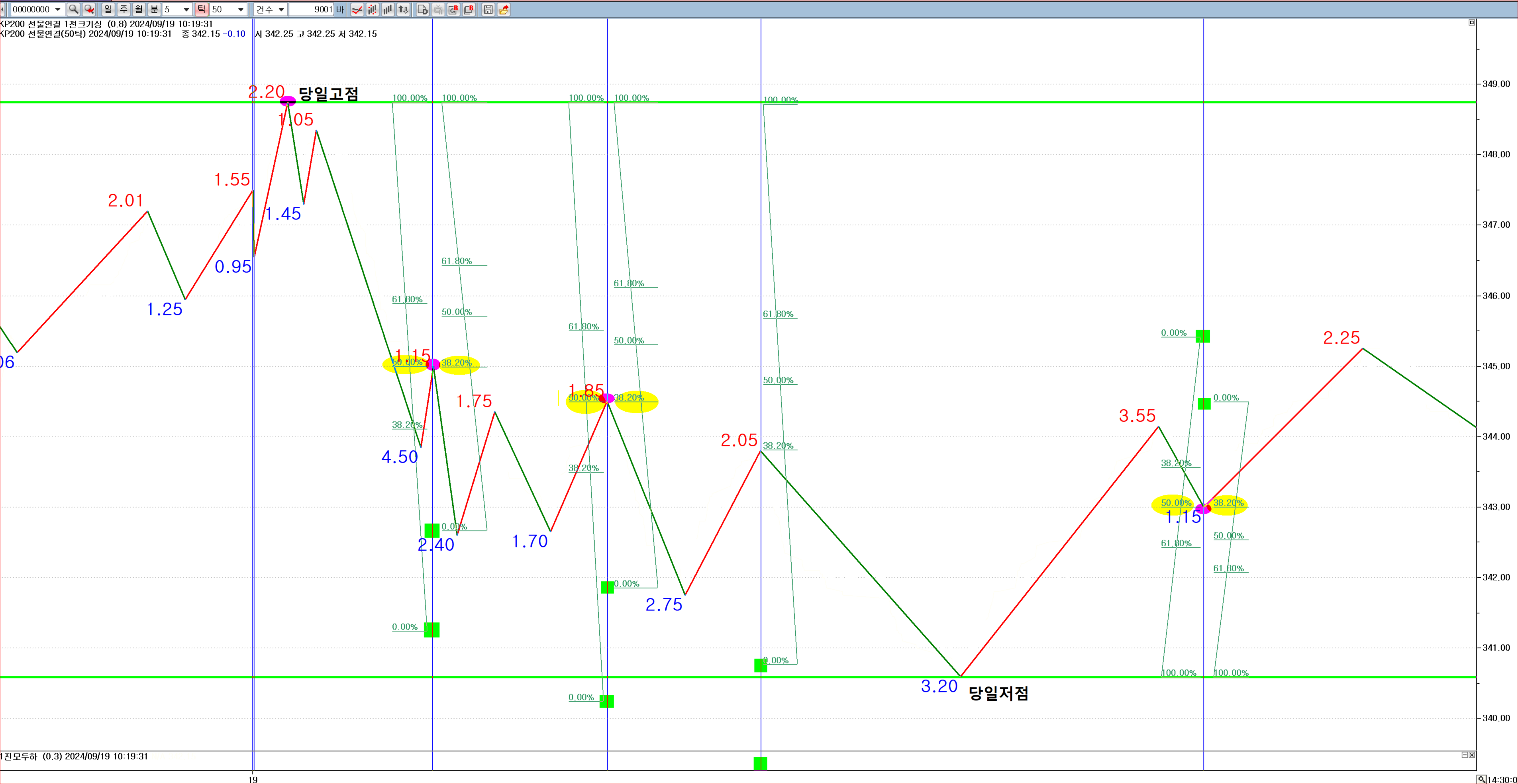 낮은 추세선의 상단을 당일 고점으로부터 50%라고 가정하고 0% 되는 지점에 네모 표시.