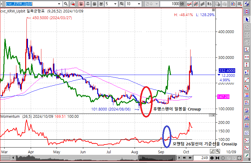 단, 후행스팬 26일선이 Crossup 하자마자 모맨텀 26일선이 기준선을 Crossup하는 위치는 무효입니다.