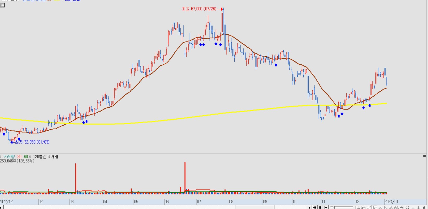 2. 이전 골드 후 정배열 기간은 60봉 이상, 데드후골드 기간은 20봉 이하인 종목.