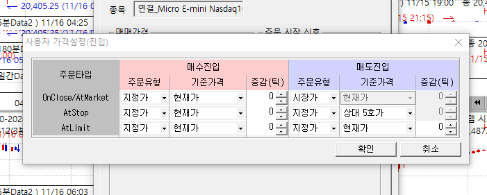 매도진입이나 매수포지션청산은 기준가격은 현재가로 증감틱을 -10틱과 같이 낮은 틱으로 지정해 주시면 됩니다.