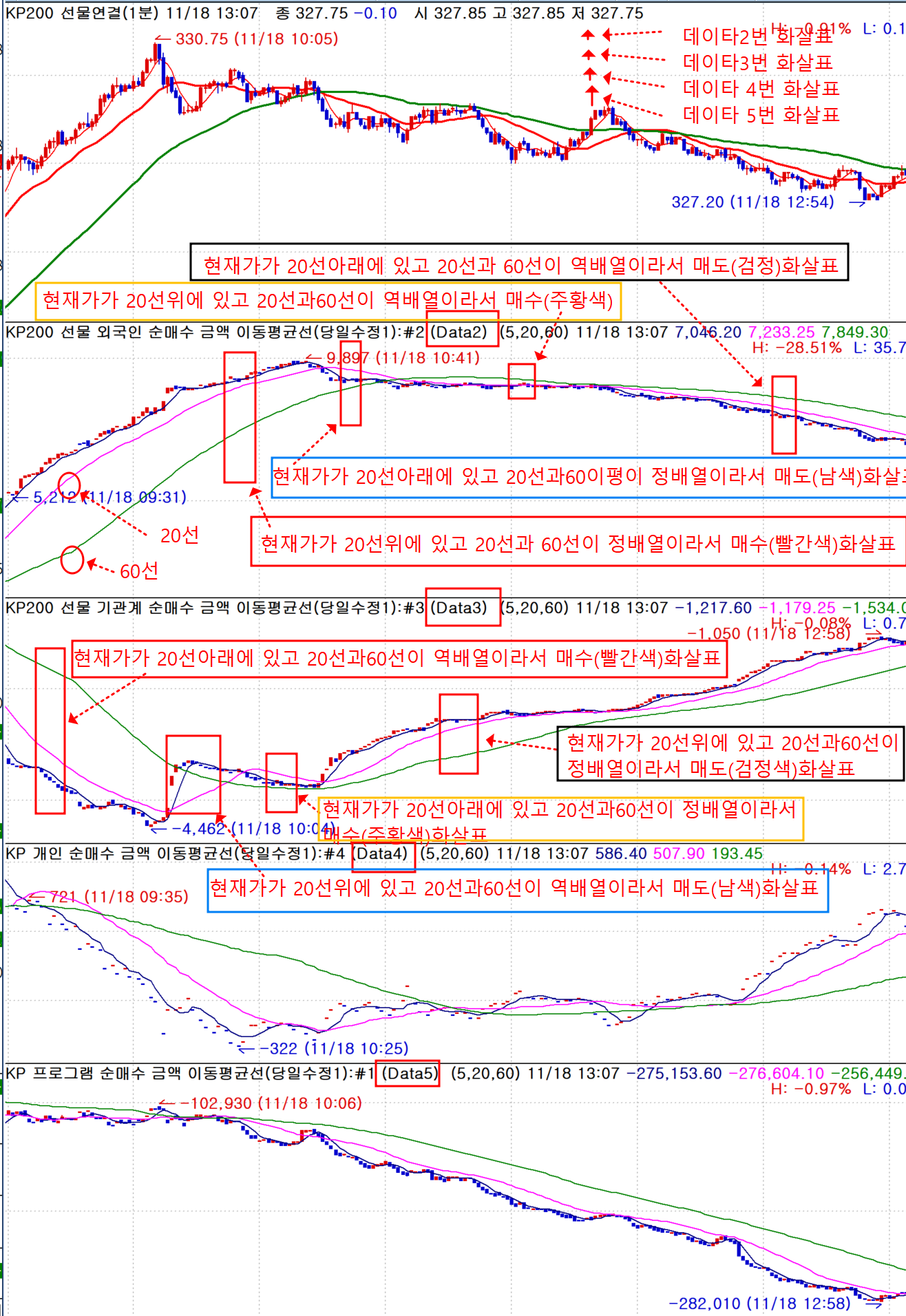 > 참고 그림처럼 맨위 선물차트와 아래에 보조지표 1,2,3,4가 있는데 ..이보조지표가 각각조건을 만족할때 선물차트에 매수/매도 화살표 가나오도록 하는수식을 만들고 싶습니다.