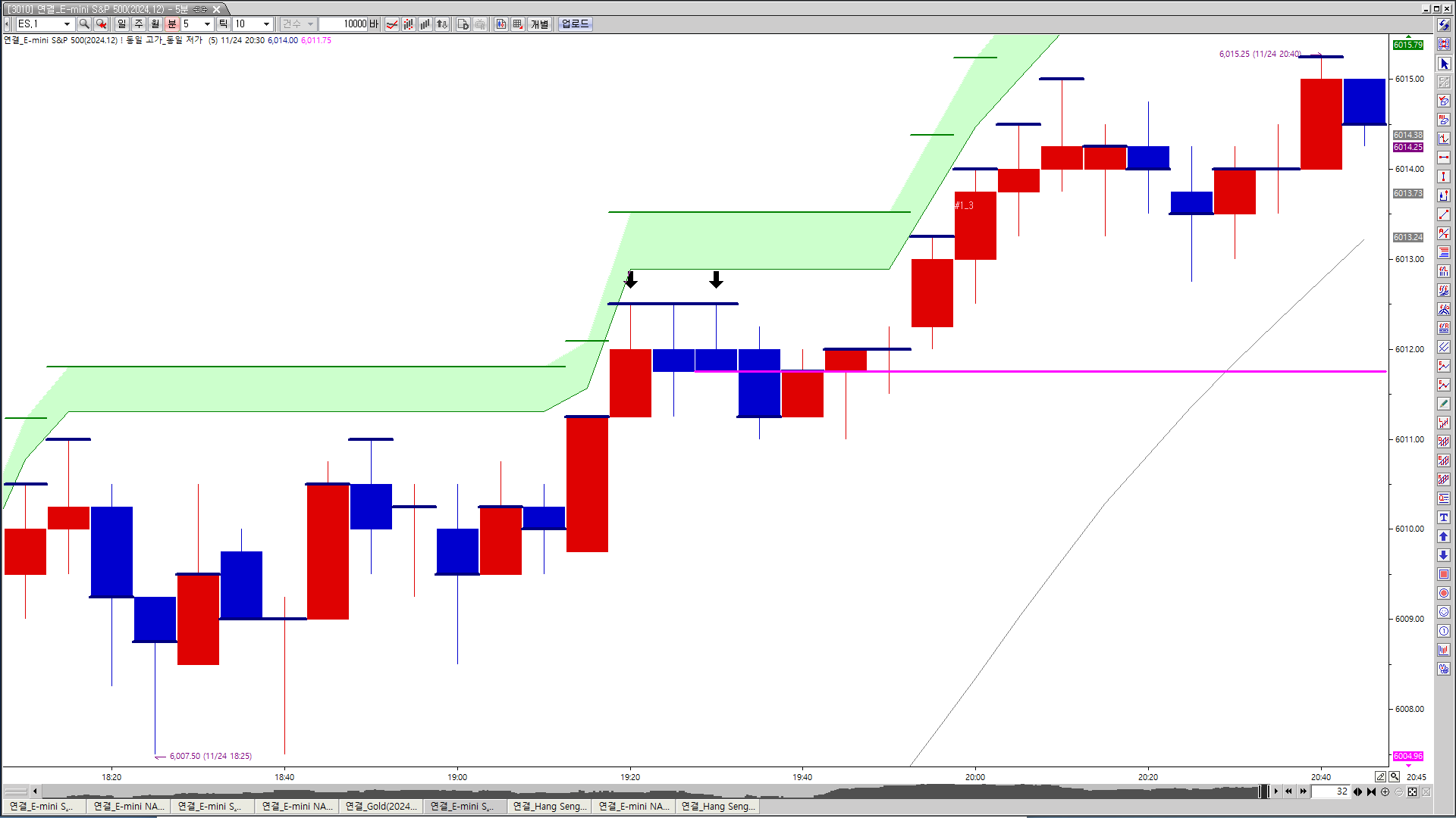 첨부된 그림의 화살표 부분과 같이 분봉 차트 기준으로