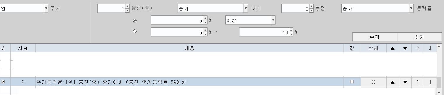 제가 원하는거는 일봉 0봉기준 전일종가 대비 5프로 이상인종목은 안사는(중요) 조건입니다.