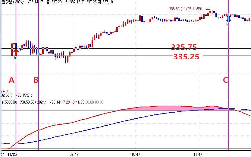 올린 그림중에 A 에서 b1신호가 나와서 1계약 매수한후에(335.75 에 매수)