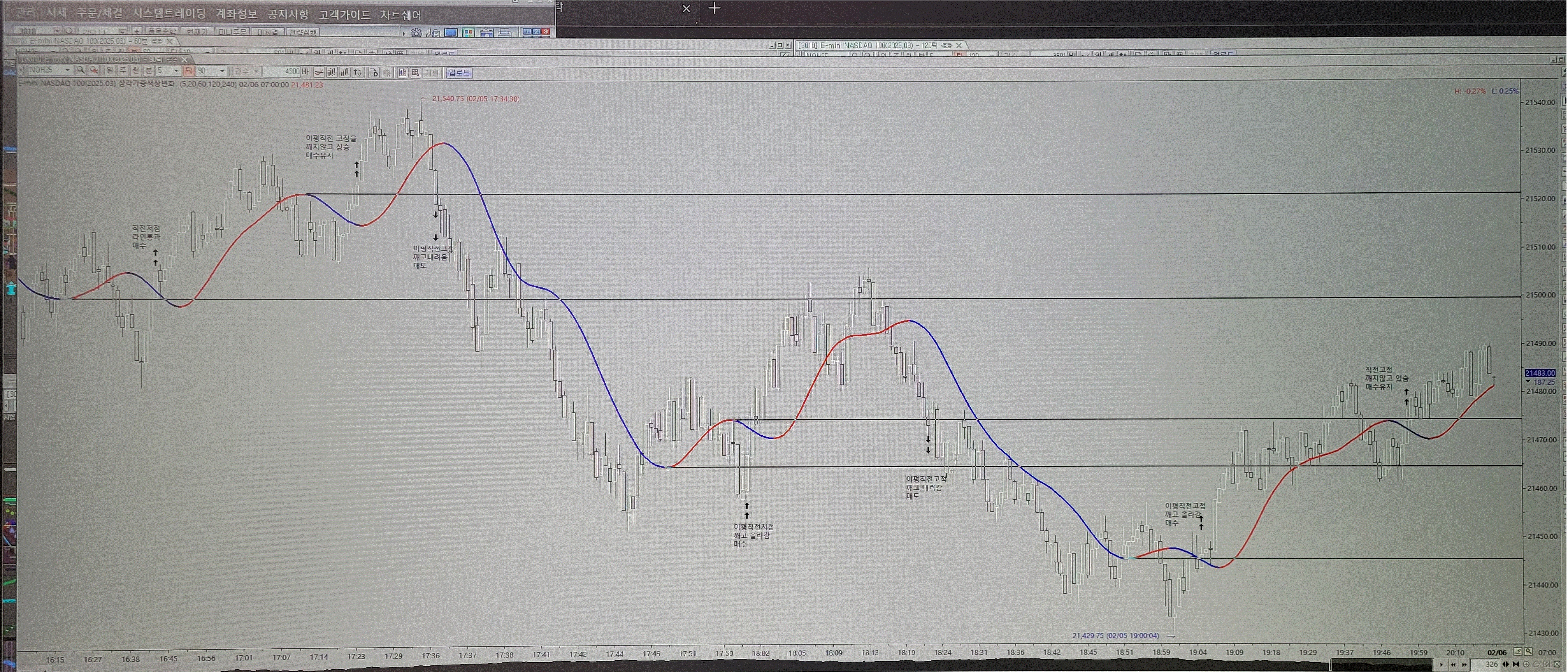 캔들이 종가상 20 이평의 직전 고점을 통과하여 하락하면 다음봉에 매도