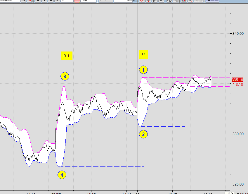 3,첫시작 볼밴 상단밴드 최고점을 익일 Y축까지 그리기