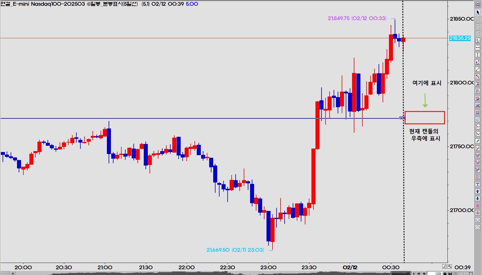 차트에서 현재 캔들과 같은 수직 라인에 표시가 되고 있습니다.