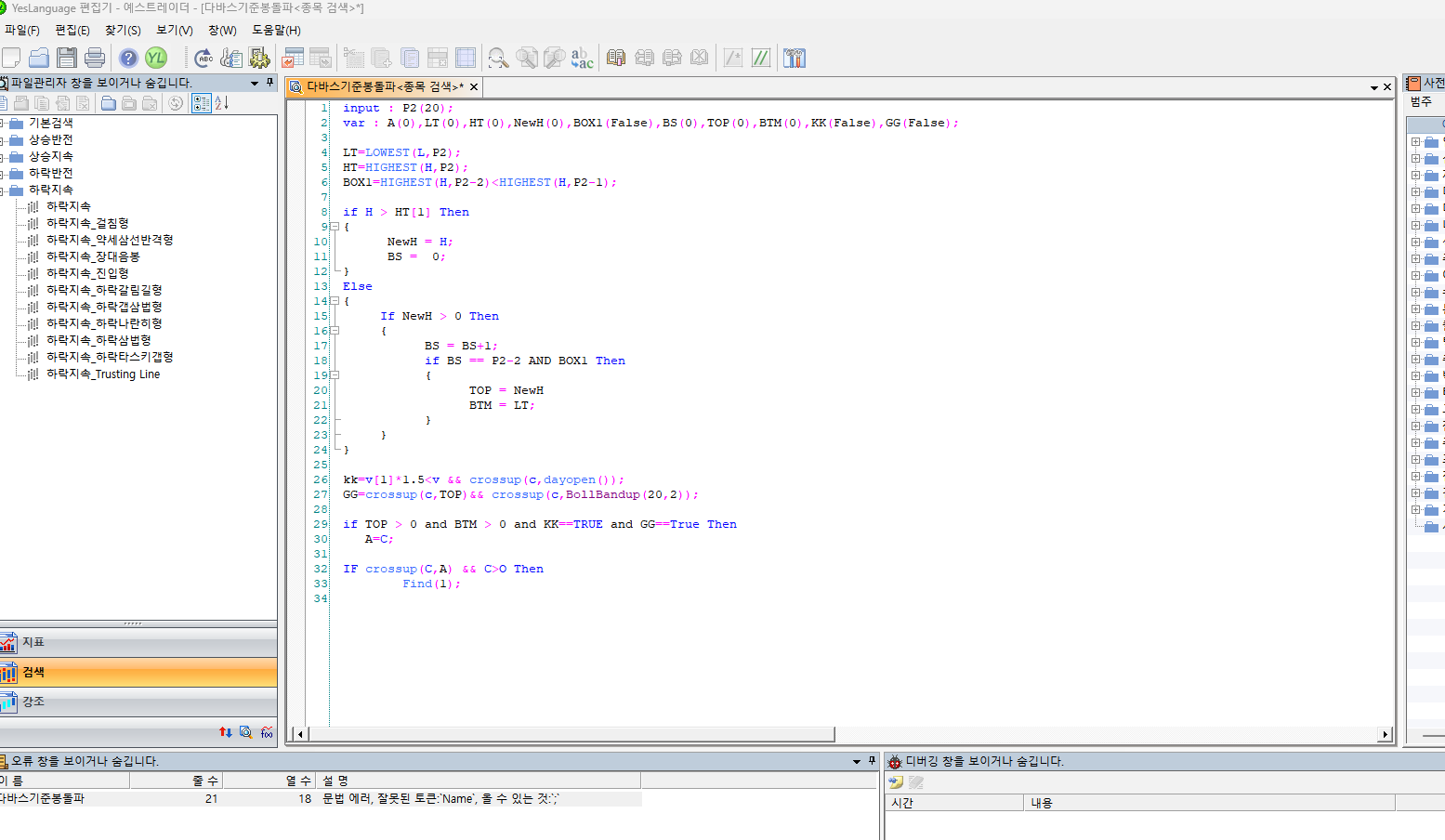 안녕하세요 예스스탁입니다. 21번째 줄에 문장에 ;를 추가하시면 됩니다. TOP = NewH; 즐거운 하루되세요 > 덕봉거사 님이 쓴 글입니다. > 제목 : 종목검색식 오류 수정요청드립니다. > 그림과 같이 오류가 나옵니다, 수정 부탁드립니다.