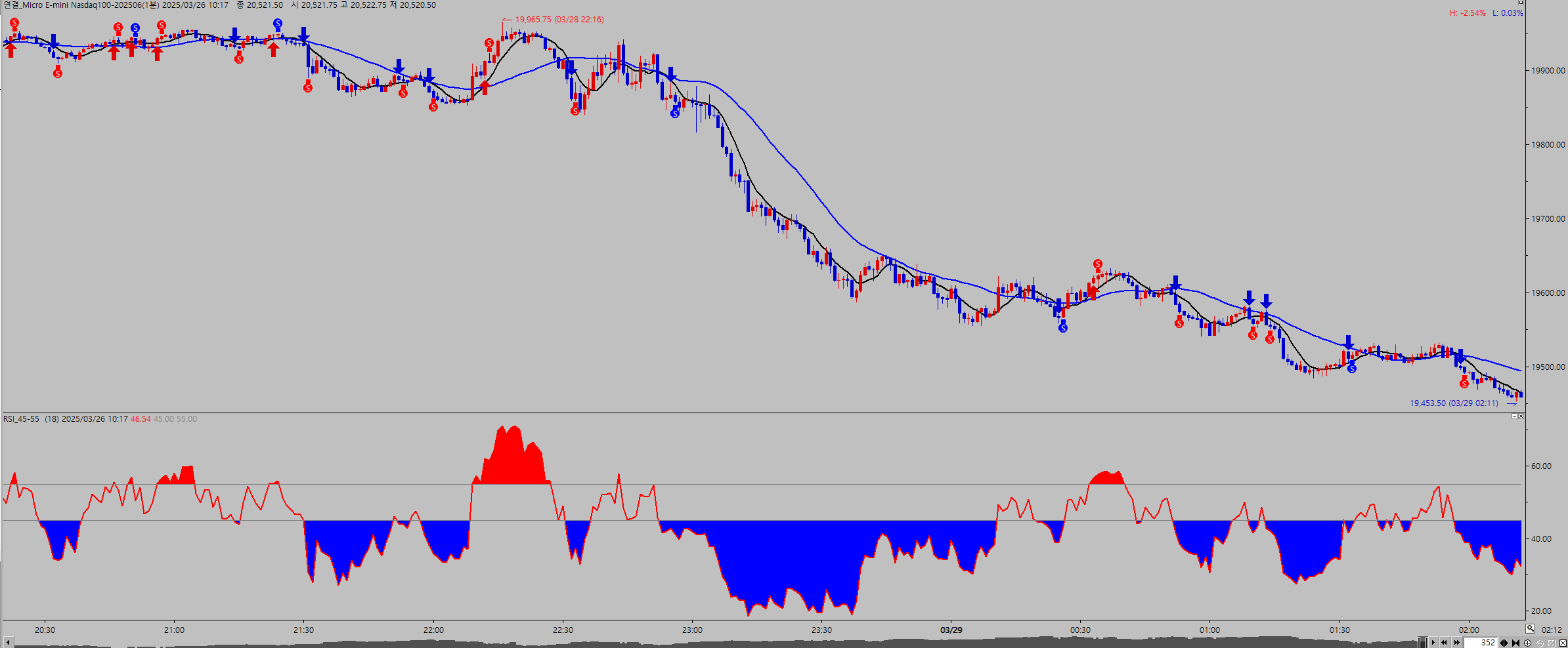 1. 문의사항 : 의뢰드린 수식을 차트에 적용시켜보니 적용이 안되는 구간도 보이는 것 같은데 설명부탁드립니다. 차트에서 23:00시경부터 01:00 까지조건을 만족해 보이는데도 신호가 뜨질 않습니다.7일선과 27일선이 역배열이고 RSI가 45 이하이면 매도신호가 떠야되는게 아닌지요?