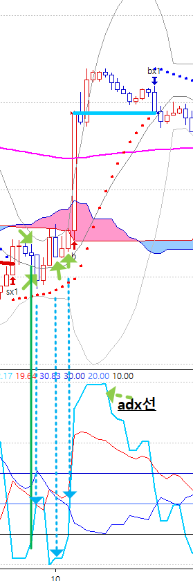 각 봉의 t2값과 adx값 확인하시기 바랍니다.