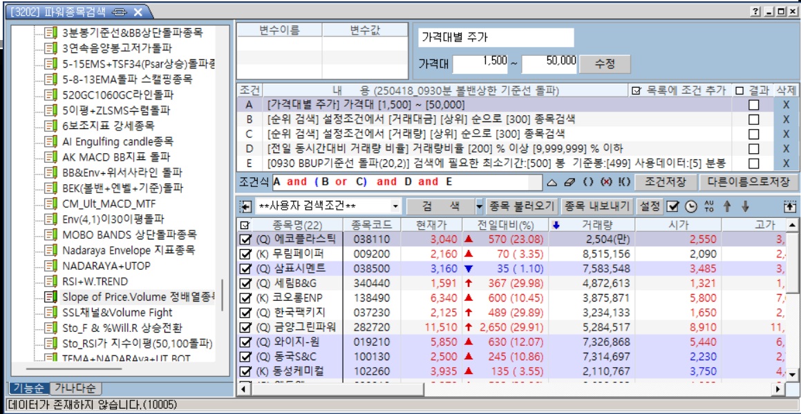 그다지 까다로운 조건이 들어가지 않은 수식임에도 불구하고 분봉기준으로 검색을 하면
