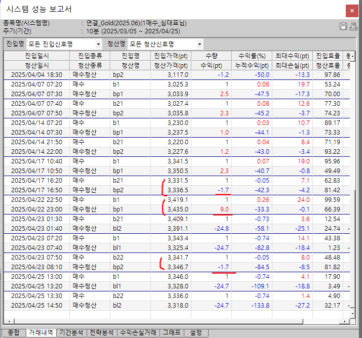 그런데 매수, 매도 시스템 전부 시스템성능 보고서와 전략실행 차트에서 수익과 손실을 잘못 인식 하는것 같습니다...