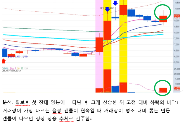 • 조정 기간: 상승 후 주가가 5일 이상 조정(하락)을 받으며 거래량이 감소.