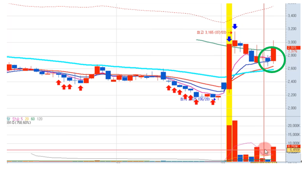 • 이평선 지지: 5일 또는 10일 이동평균선 부근에서 지지를 받는 모습이 관찰되면