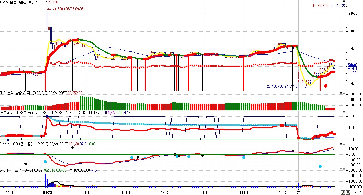 > 6/24일 HMM 3분봉 차트에 나타난 지표 9시 45분 발생한 빨강 원형 마크