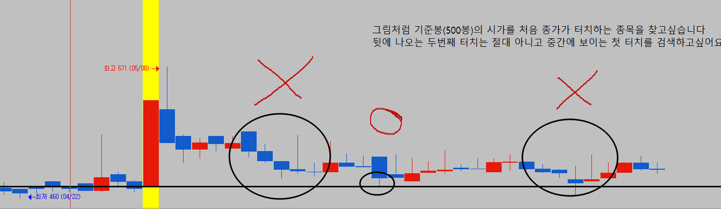예전에 문의한 사항입니다.종목 검색중에 과거기준봉의 시가를 저장후 그 가격을 처음으로 종가가 진입했을때 종목을 찾는것인데 두번째 진입할때도 검색으로 나옵니다 (첨부파일) 혹시 두번째이상으로 진입하는 종목은 필터링이 가능하도록 부탁드립니다.최소봉갯수는 500으로 하고있습니다.그리고 이평을 30이평과 60이평을 같은방식으로 추가부탁드립니다.