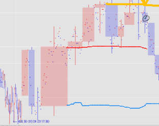이 상태에서 하루 중 가장 큰 5분 box의 시가와 종가에 수평선을 첨부파일과 같이 추가할 수 있음 감사 하겠습니다. 시가에 그려진 수평선은 파란색 종가는 붉은색!