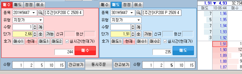 왼쪽주문창은 콜옵션 매수이고, 오른쪽 주문창은 풋옵션 매도입니다.