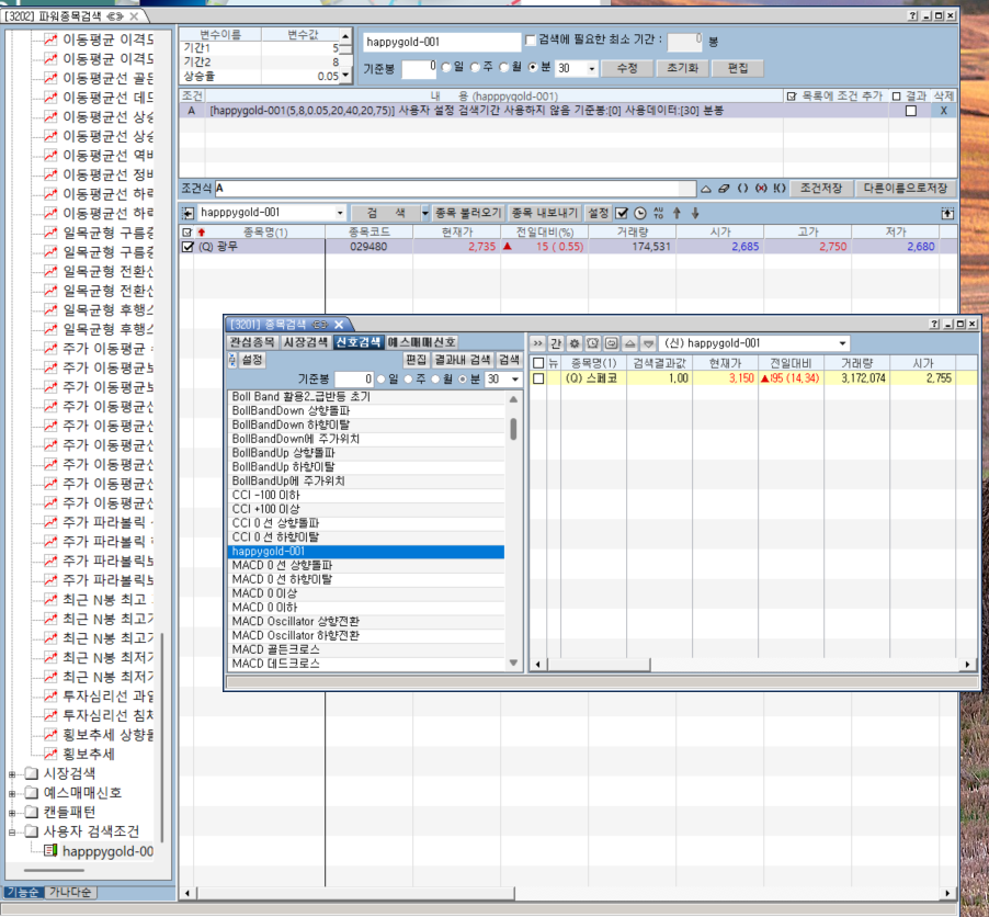 "파워종목검색"과 "종목검색" 창에서 동일한 조건으로 검색해보니