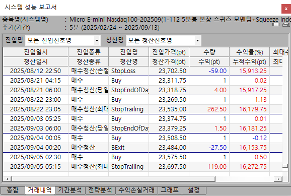 > 변수값 최적화를 위해서 5분봉 챠트로 2/24~9/13일까지 시뮬레이션 챠트를 돌려보니 9/8~9/12일까지의 거래 내역이 전략실행 챠트에서는 있었으나 시뮬레이션 챠트에서는 나타나지 않는데 왜 그럴까요?