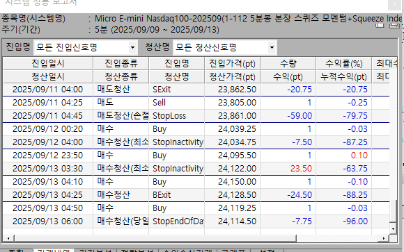 변수값 최적화를 위해서 5분봉 챠트로 2/24~9/13일까지 시뮬레이션 챠트를 돌려보니 9/8~9/12일까지의 거래 내역이 전략실행 챠트에서는 있었으나 시뮬레이션 챠트에서는 나타나지 않는데 왜 그럴까요?
