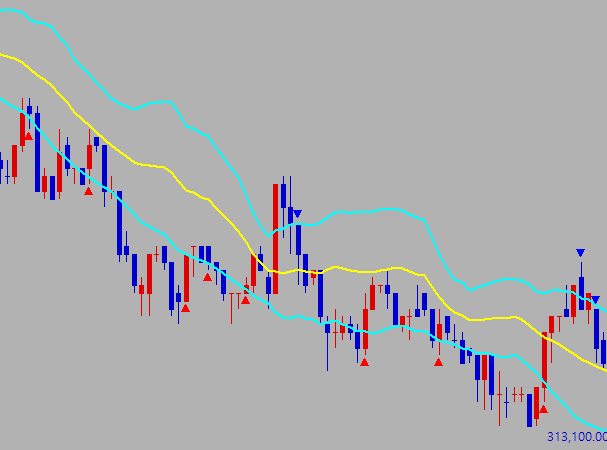 음봉으로 밴드 상단을 뚫고 내려와서 종가가 밴드안에 들어오면 청산