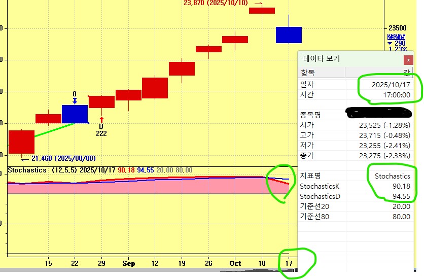 오늘 10/17일 금요일 봉이 완성되는 날이고, 시스템식 상으로는 주문 예비신호가 나와야 되는 것 같은데, 예비신호가 나오지 않아서 제가 잘못 이해하고 있는 부분이 있나 싶어서 질문 하오니 왜 안나오는 지 검토하여 주시기 부탁드립니다. 차트는 그림파일로 첨부하였고, 스토캐스틱 K값이 D값을 데드 크로스했습니다.
