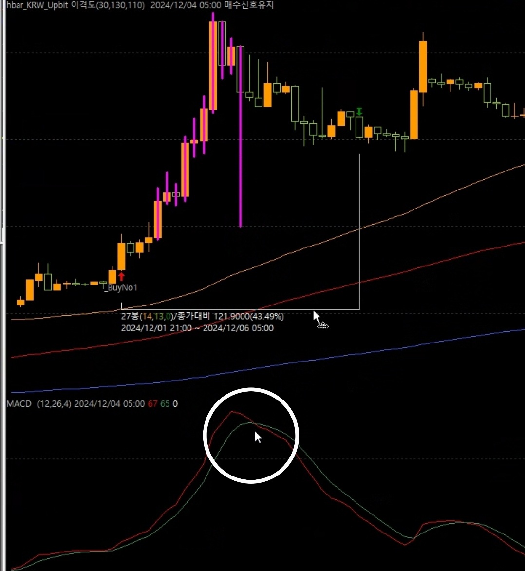 1. 아래 사진은 이격도 크로스업,다운 매수매도 지표입니다. 이 지표를 macd 0 크로스업,다운 매수매도 식에 대입하여 macd 0 크로스업 매수 이후 이격도 신호가 발생했을경우 이격도신호 구간에 macd 시그널이 크로스 다운시 매도하는 식을 추가하고 싶은데 변경 부탑 드립니다.