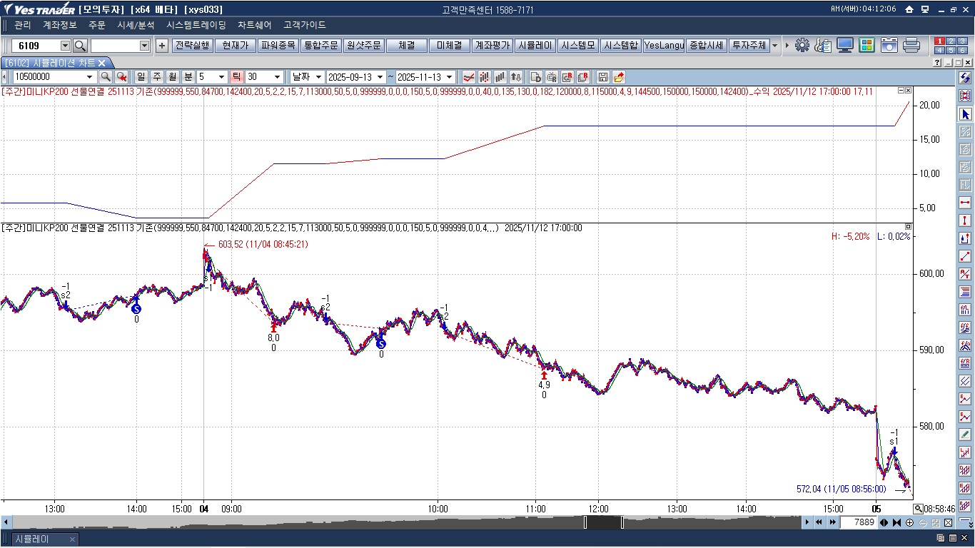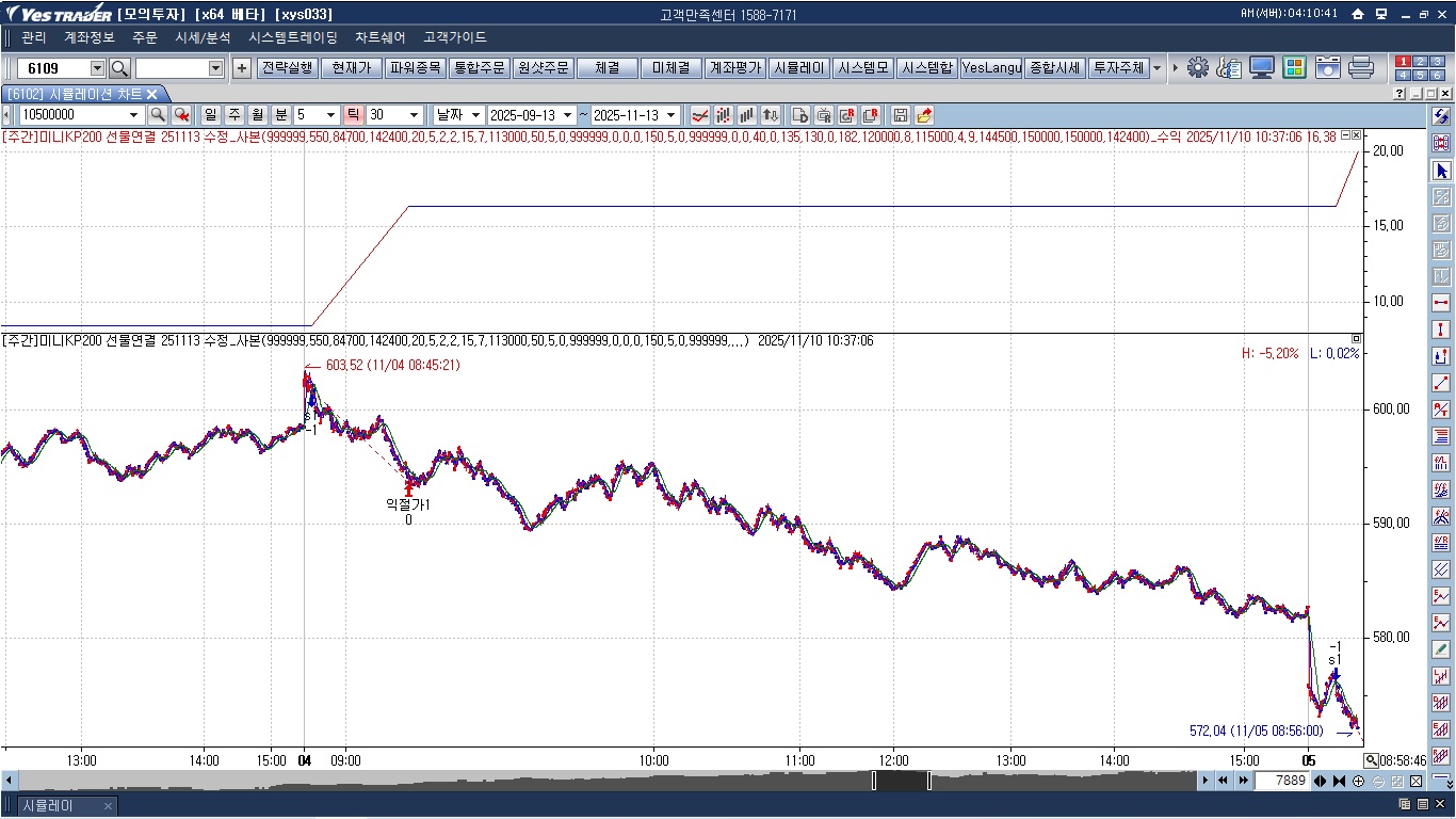input : 거래횟수(20),누적패수(5),연속패수(2),누적패수조정(2),bigdown(15.00),조정거래횟수(7),조정진입제한시간(113000);
