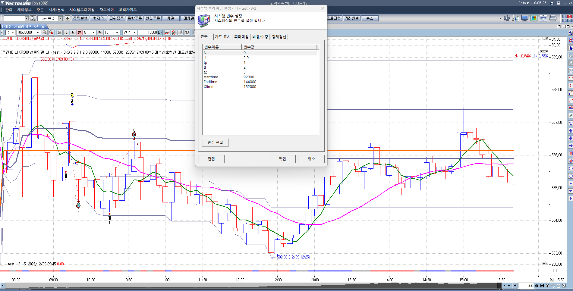 input : N(3),st(2),tp(3),tl(1),t2(2); input : starttime(92000),Endtime(144000),Xtime(152000); var : Tcond(False),TT(0),T1(0),entry(0); TT = TotalTrades; IF Xtime > starttime Then SetStopEndofday(Xtime); Else { if sDate != sDate[1] Then SetStopEndofday(Xtime); } if (sdate != sDate[1] and sTime >= Endtime) or (sdate == sDate[1] and sTime >= Endtime and sTime[1] < Endtime) Then { Tcond = False; } if (sdate != sDate[1] and sTime >= starttime) or (sdate == sDate[1] and sTime >= starttime and sTime[1] < starttime) Then { Tcond = true; T1 = TT[1]; IF Xtime <= starttime Then { SetStopEndofday(0); } } entry = TT-T1+IFF(MarketPosition != 0,1,0); 요 부분에 대해서 간단히 주석이나 설명 좀 부탁드리고 싶습니다.