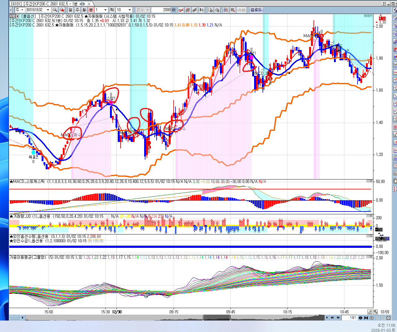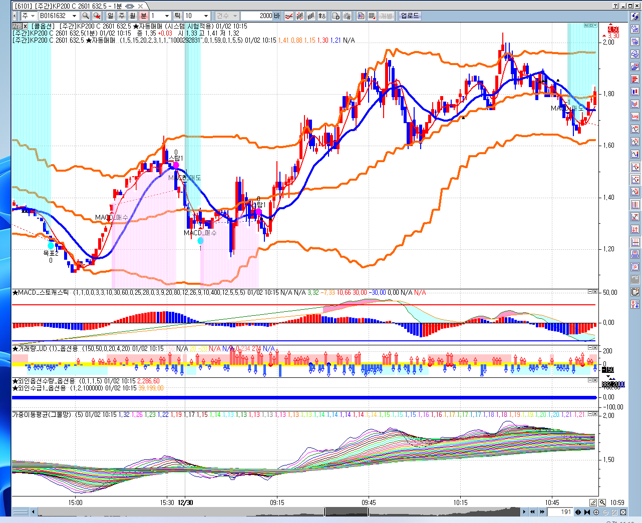2. 이번에는 외부데이터 (외인수급, 옵션수량) 을 코드에 삽입했을때의 진입 청산 내용을 캡쳐한 사진입니다.