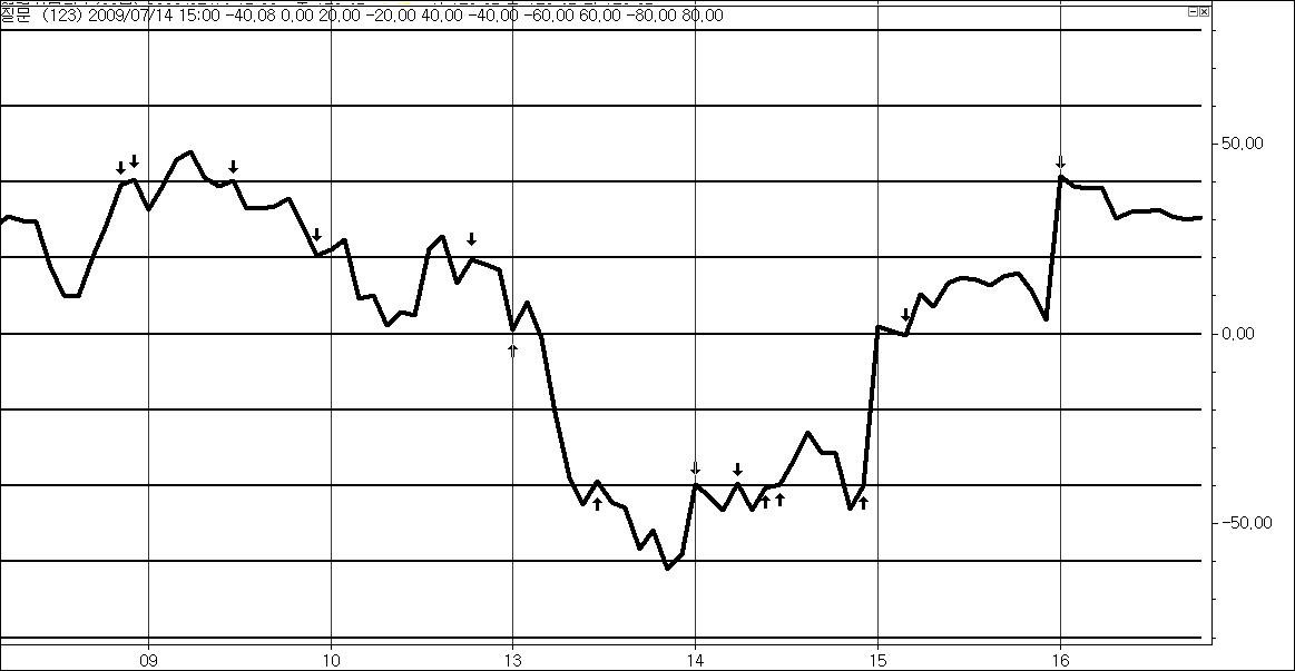 먼저 한 개의 보조 지표와 0값을 갖는 선을 중앙으로 각각 위로 20선,40선,60선,80선 다시 아래로는 -20선,-40선,-60선,-80선 이렇게 9개의 기준선이 있습니다. 화살표는 보조지표와 기준선의 차가 1 이하인 곳을 나타냅니다. 화살표가 나타내는 곳의 기준선값을 리턴하는 식을 부탁합니다.