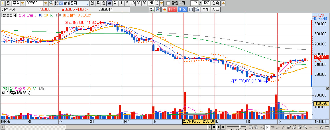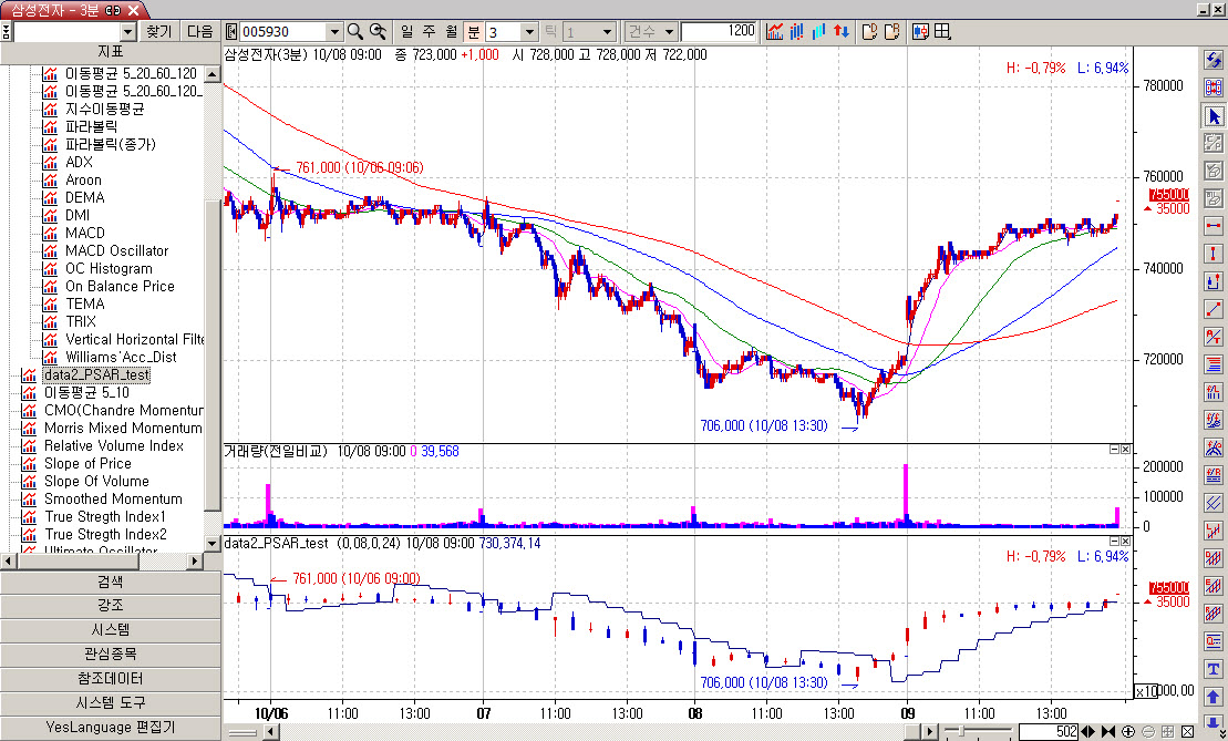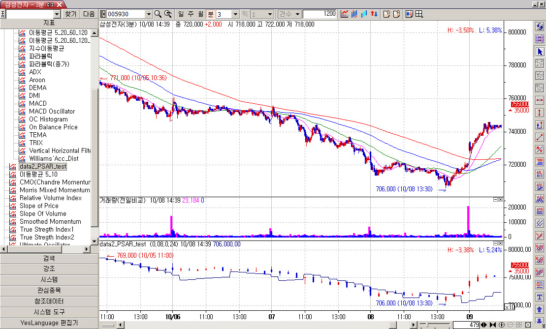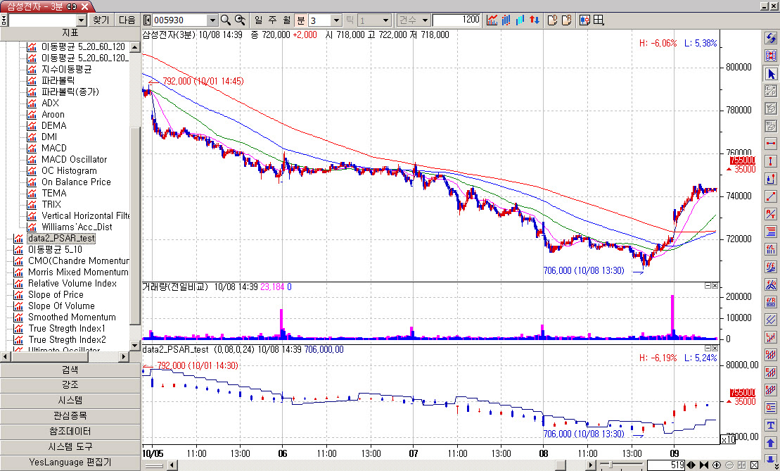 지표를 다음과 같이 만들고.삼성전자 종목 챠트에 적용하였습니다.